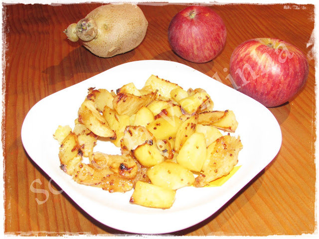 Numa necessidade de um acompanhamento prático e de usar maças... fiz este no forno, que ficou bem saboroso. Se não gostar do sabor activo da mostarda com sementes à antiga, basta usar da normal.