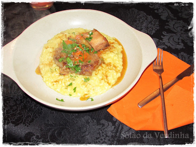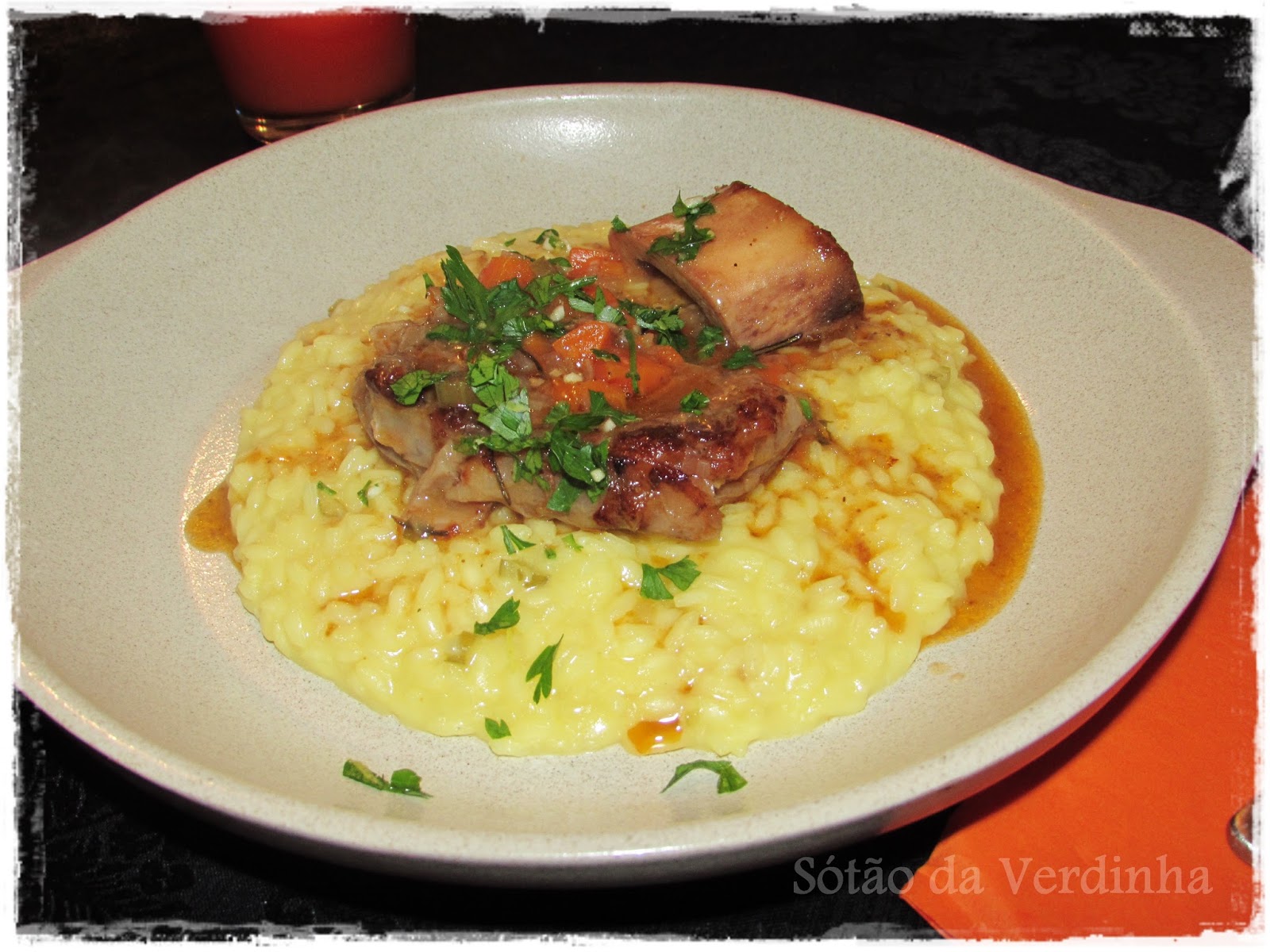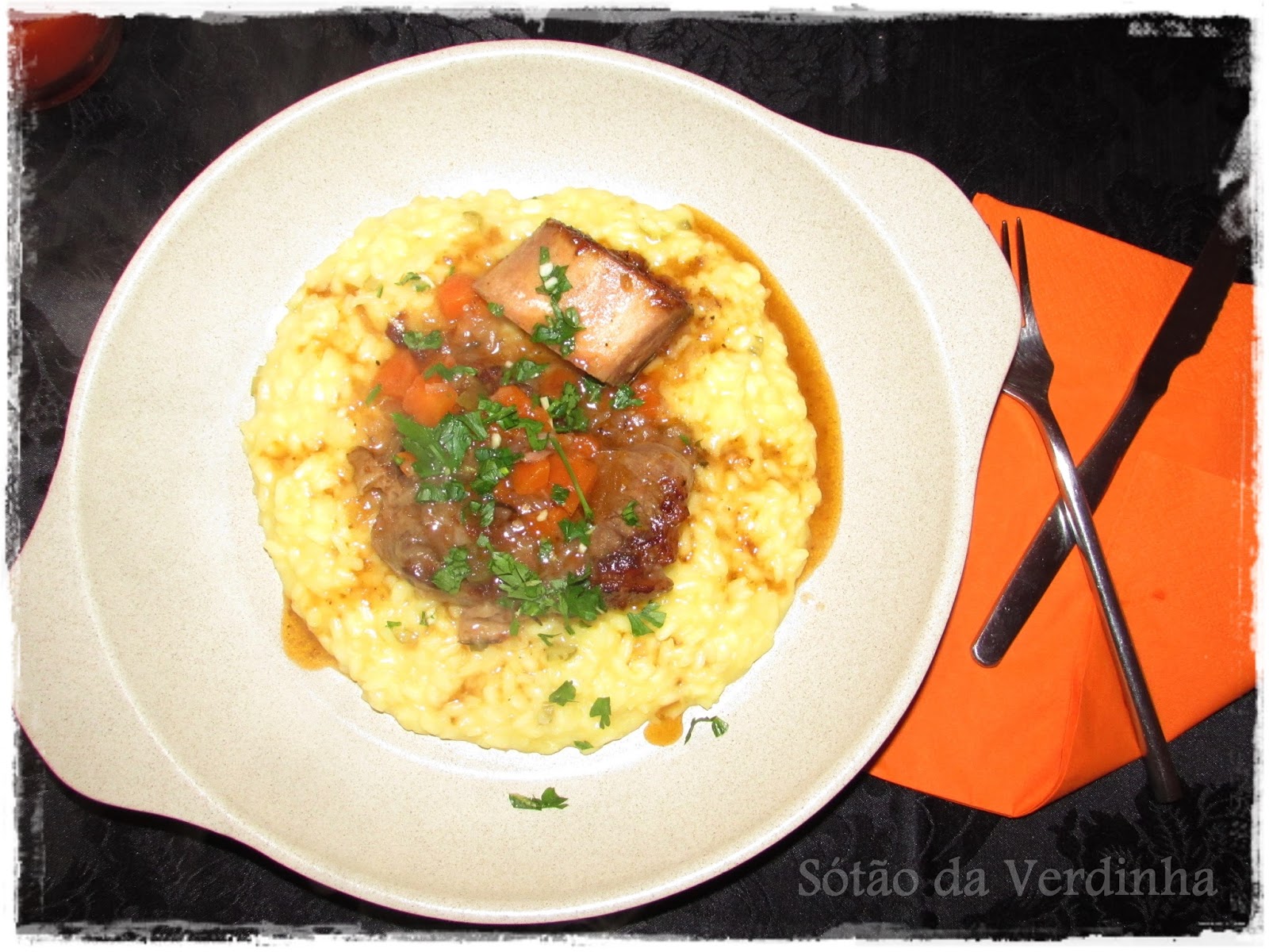 Para servir, coloque num prato uma quantidade de risotto, por cima o osso buco e por fim salpique com a gremolata ( essencial) e regue com um fio de azeite.