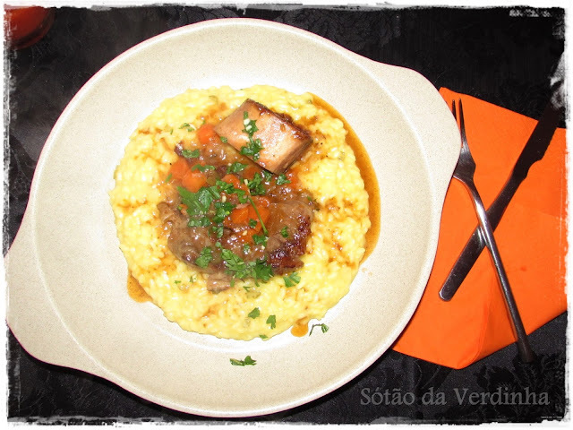 Como ele mesmo diz, este Osso Buco pode ser acompanhado com puré... mas é no Risotto de Açafrão que encontra o casamento ideal! Portanto, leve os convidados para a cozinha, um copo de vinho na mão, e faça o risotto na hora, mesmo antes de servir, no meio de dois dedos de conversa. Vai valer a pena não estar sentada à mesa antes do jantar :)